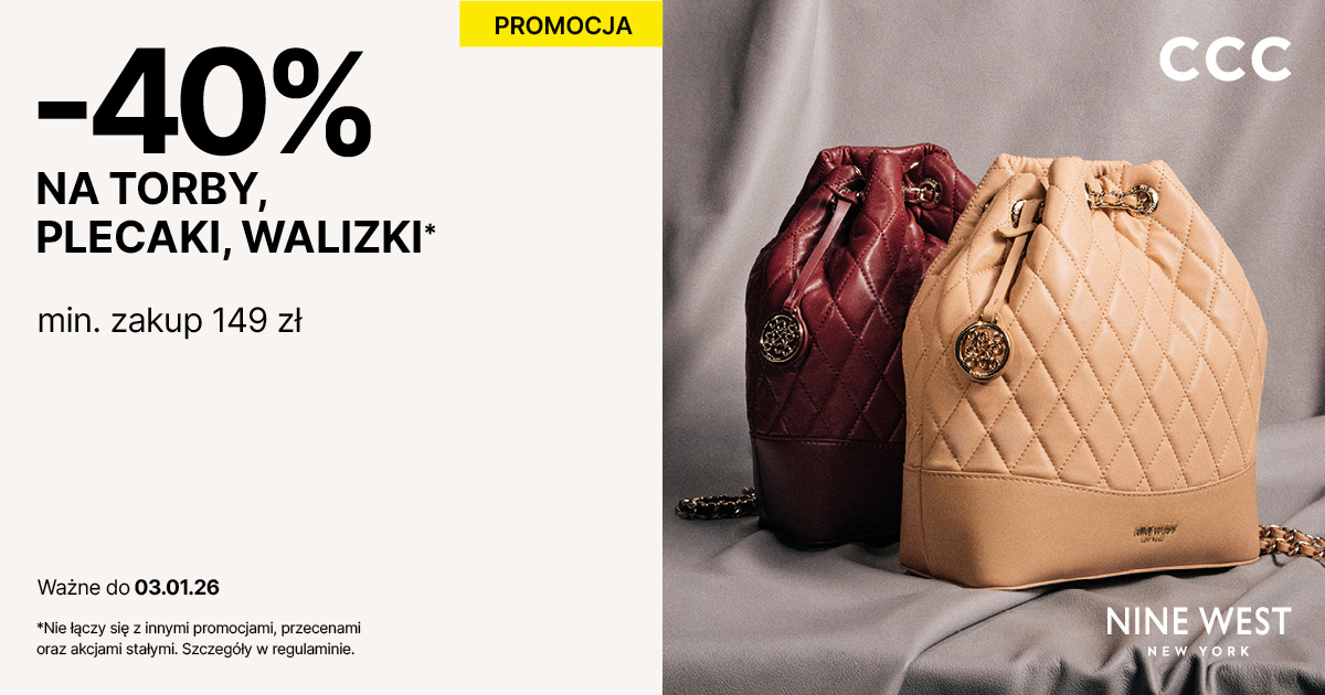 – 40% na TORBY, PLECAK, WALIZKI Stylowa torebka, wygodny plecak, praktyczna walizka – teraz kupisz 40% taniej w CCC! Zrób zakupy za minimum 149 zł i zyskaj rabat na modele znanych marek. Super ceny i najlepsze okazje – tylko w CCC!