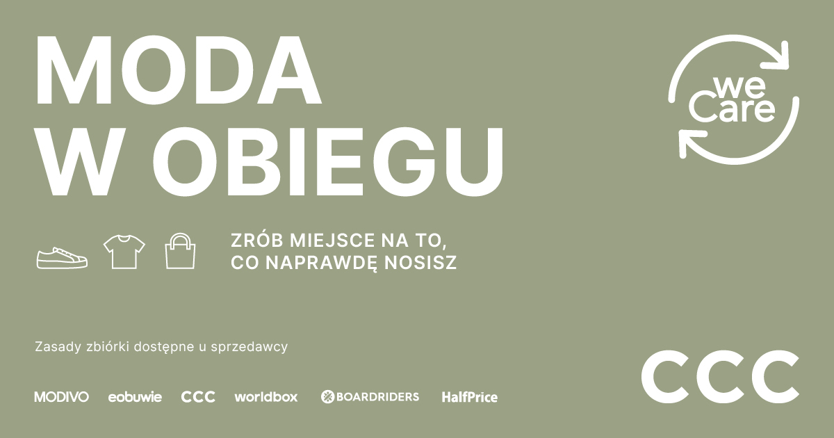 We wszystkich sklepach stacjonarnych CCC, HalfPrice, eobuwie, Boardriders w Polsce rozszerzamy prowadzoną przez nas od 2020 roku zbiórkę używanego obuwia o kolejne kategorie produktów – ubrania i akcesoria!